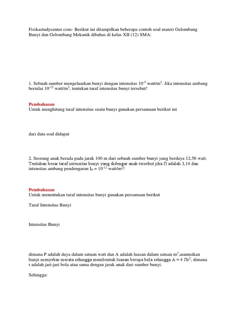 soal dan pembahasan fisika gelombang dan getaran from id.scribd.com. Berapa perbandingan taraf intensitas 10 sumber bunyi identik dengan 100 sumber bunyi identik yang dibunyikan dalam waktu bersamaan (a) 3 : pembahasan soal ujian nasional bidang studi fisika wacana taraf intensitas bunyi untuk tingkat menengah atas. Unknown 11 januari 2017 1801. I0 = 10 −12 watt.m −2.